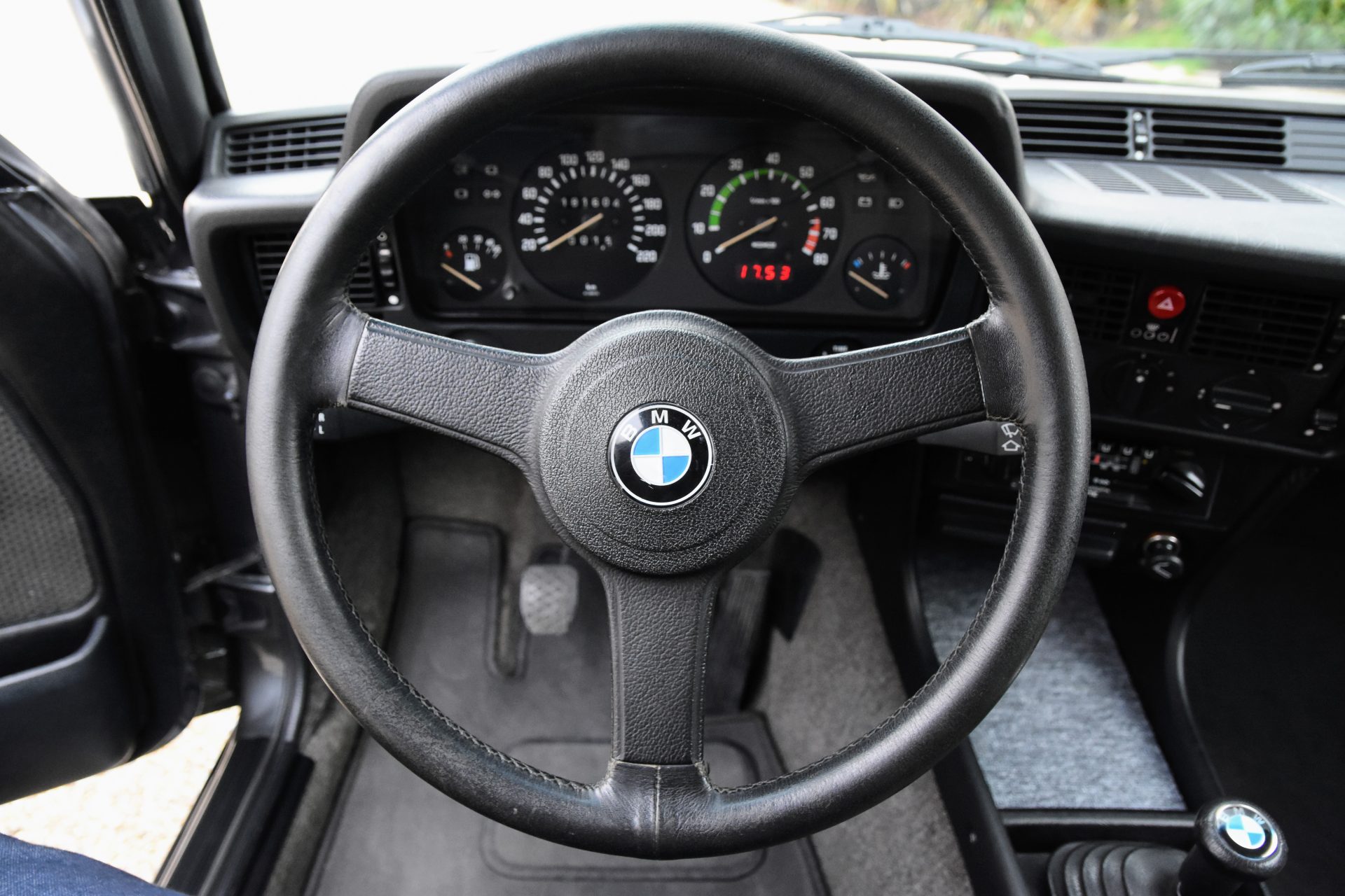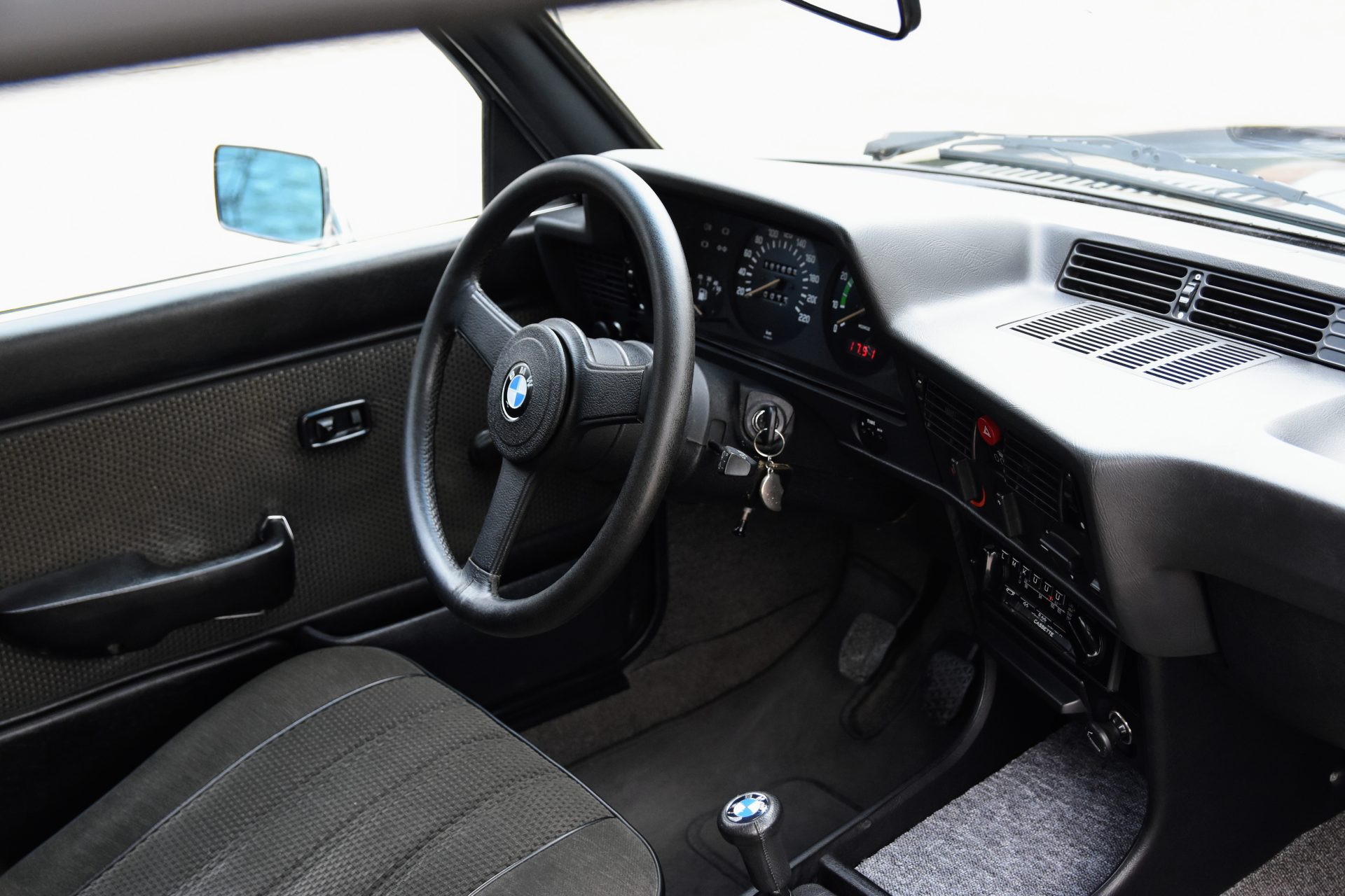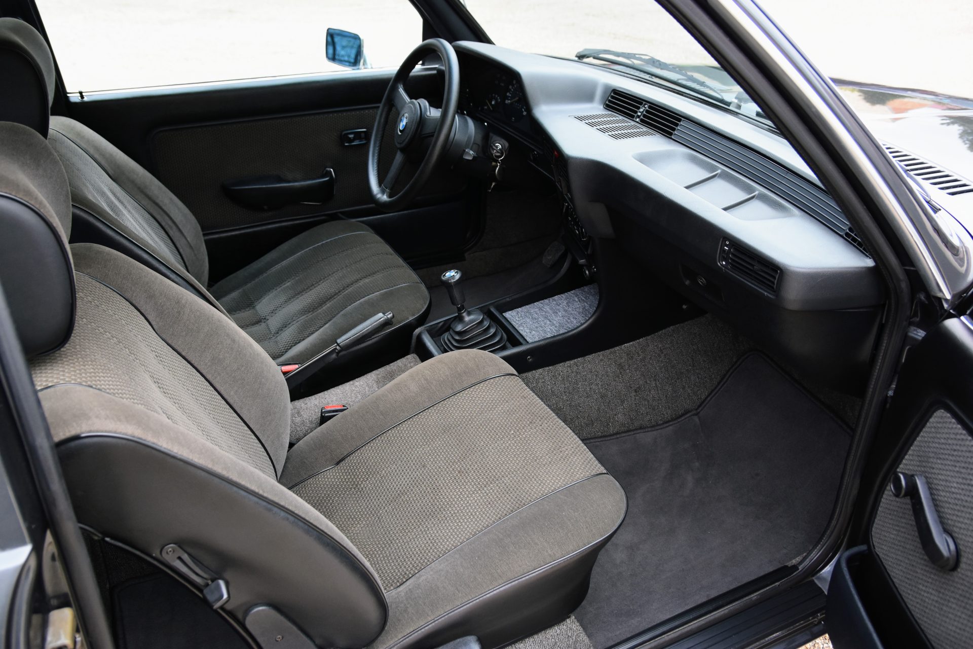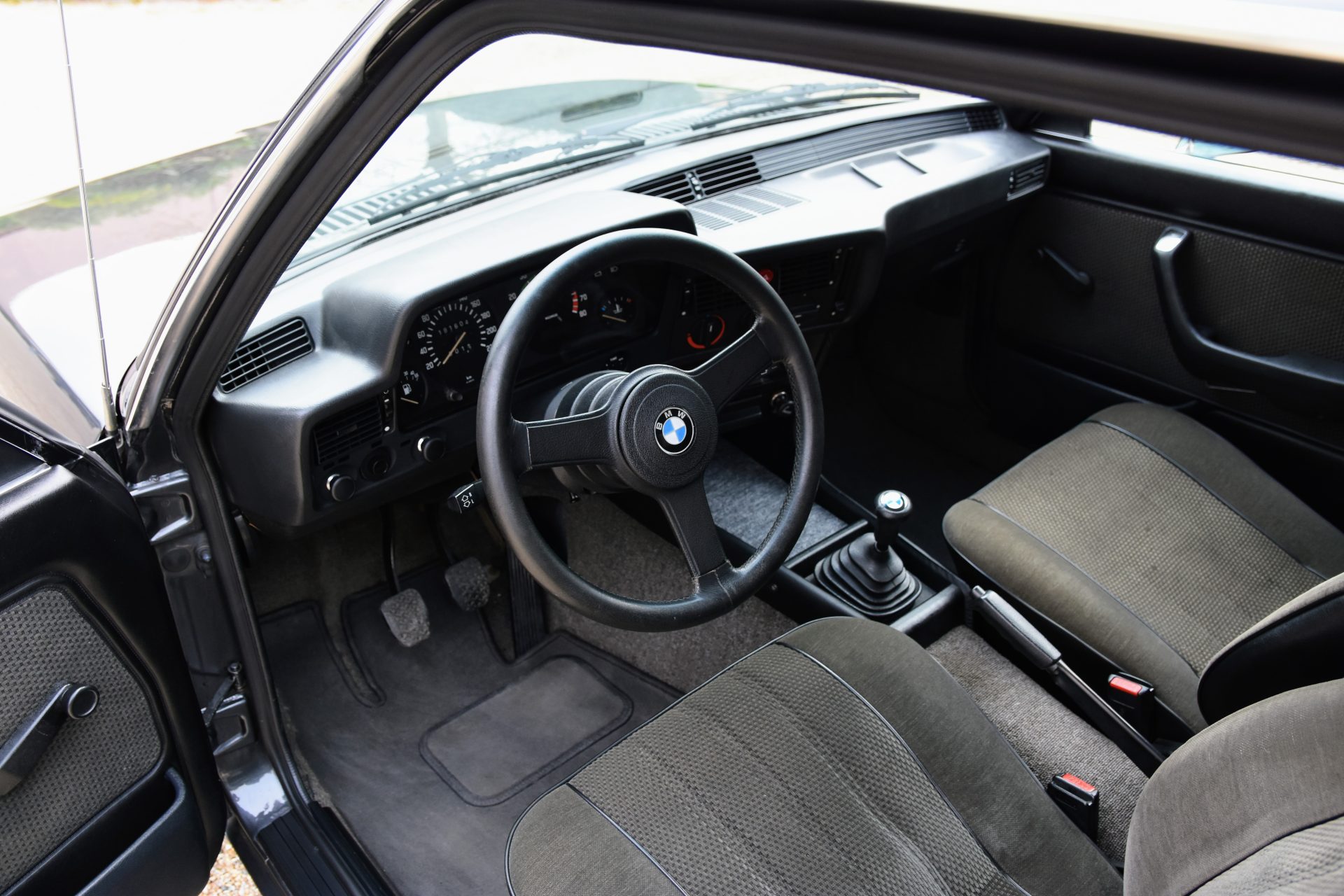 Cette série 3 a été livrée en Août 1981 dans sa jolie teinte Graphit Metallic d’origine, avec les iconiques jantes BBS en aluminium. À l’intérieur, on retrouve un beau volant trois branches BMW en cuir ainsi qu’une sellerie en velours gris.